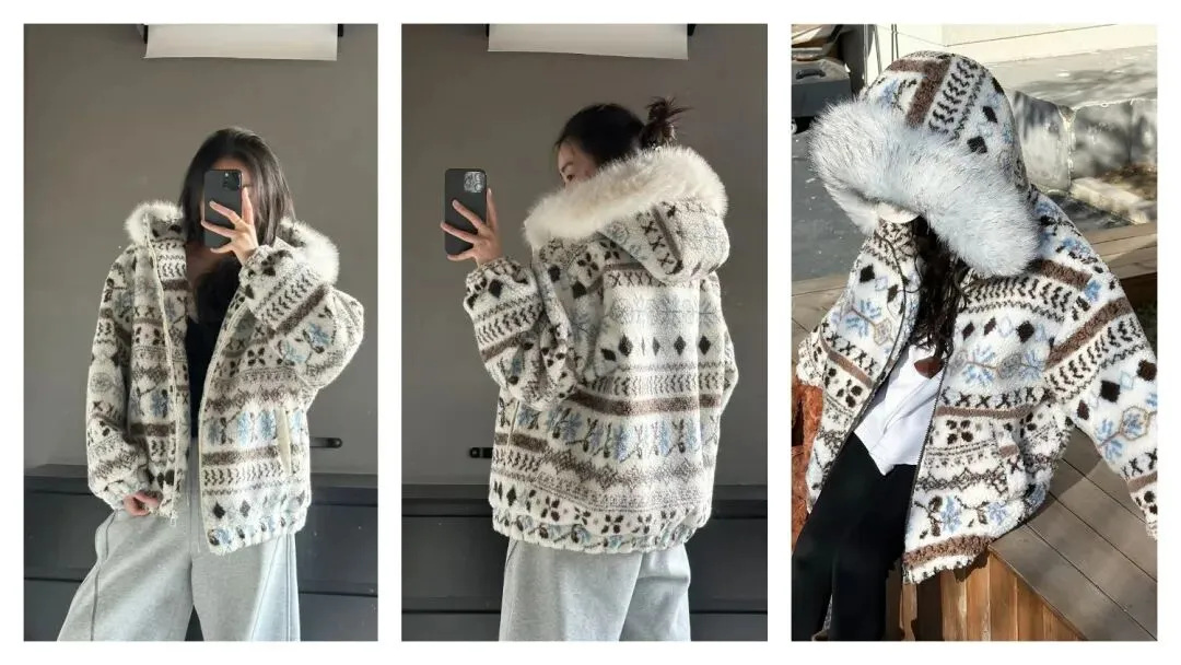 【正在团】重磅美衣!费尔岛提花大毛领仿羊羔毛羽绒服外套
