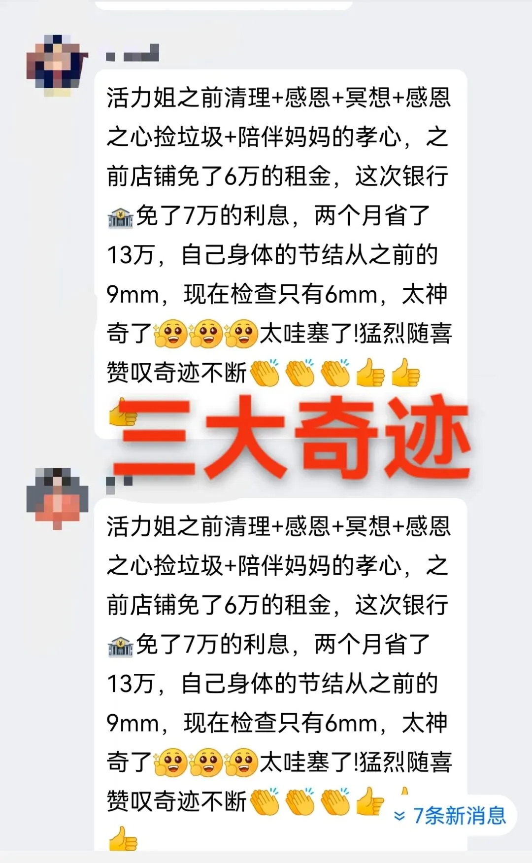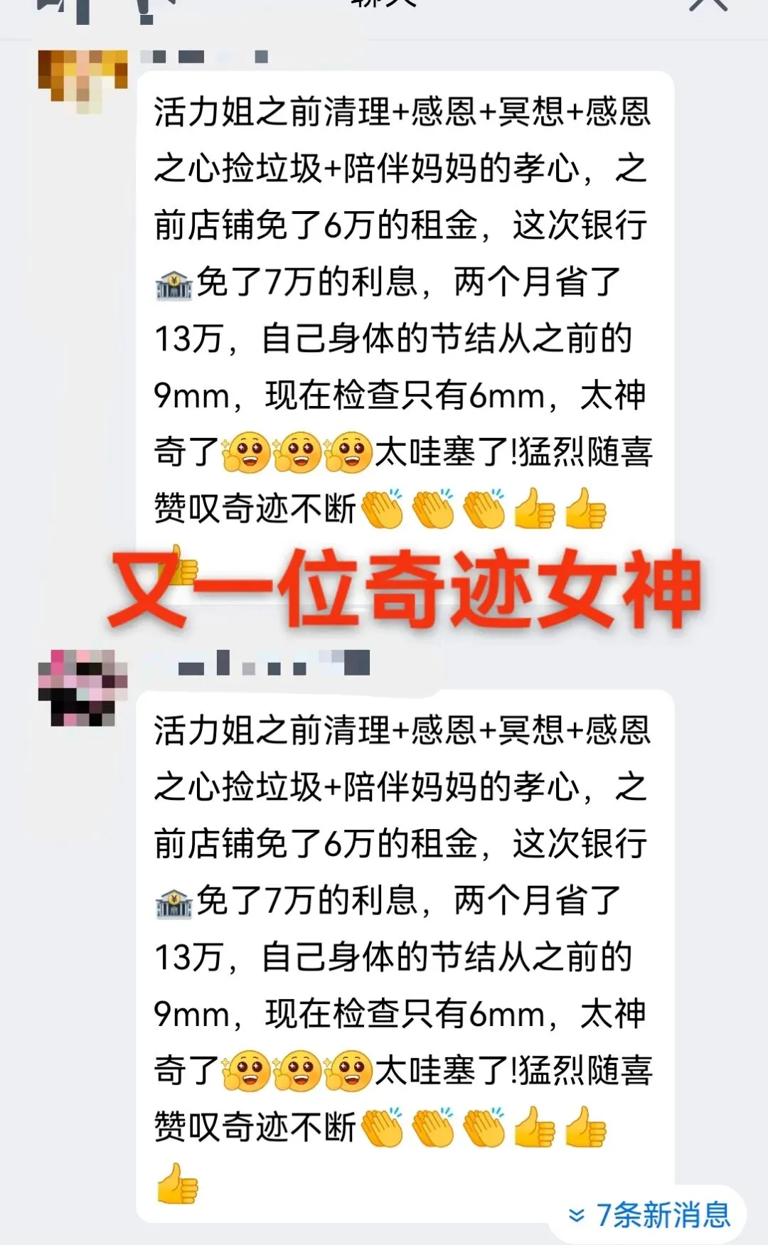 奇迹就这样发生了,银行居然为她免息 7w,这简直是想都不敢想的事;去检查身体时,肺部结节从 9mm 缩小到了 6mm;就连店铺房东都主动降了 6w 房租。这就是感恩的力量!