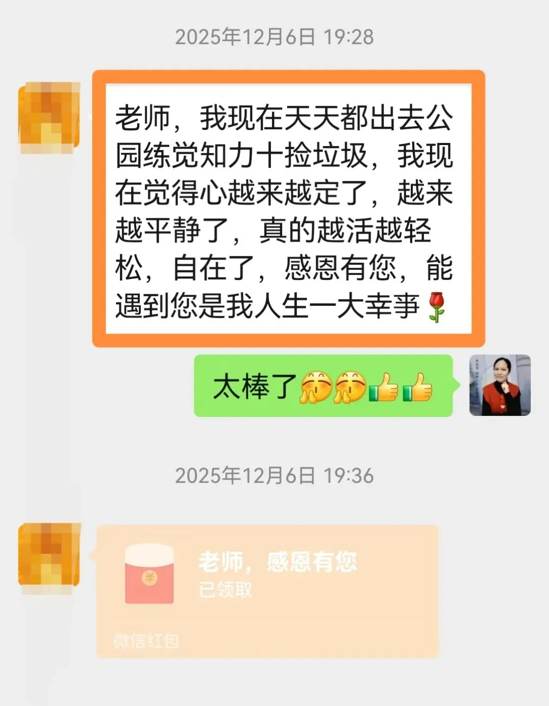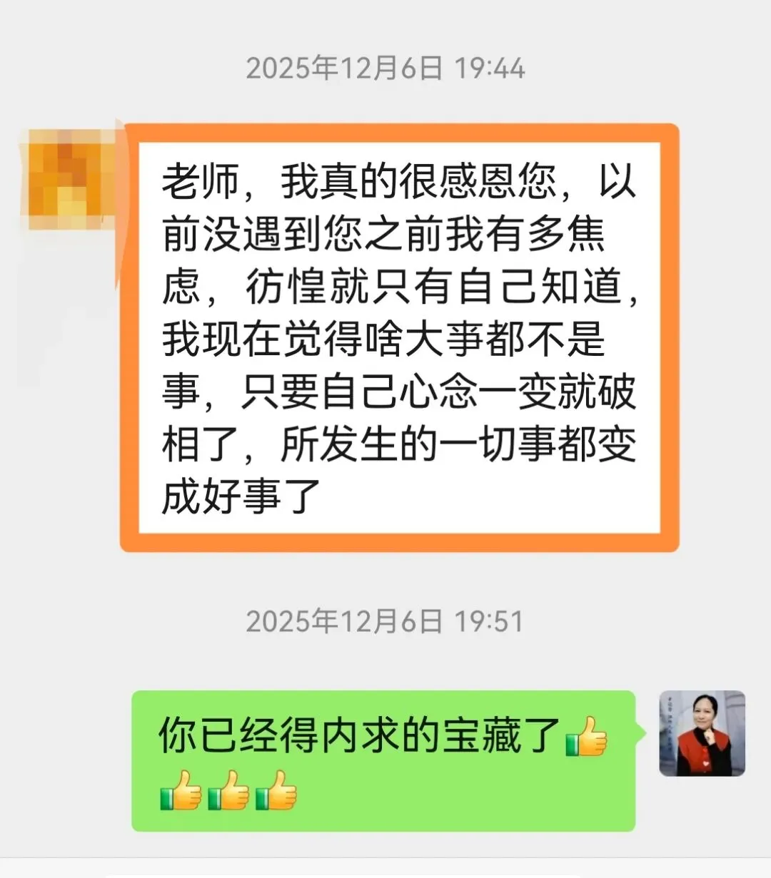 2.她肺部有9mm的结节,当时医生脸色大变,让她赶快去省城大医院,全家人都进入至暗时刻,以为大难降临,但是她跟我们定心定神,练习觉知力,随时随地清理+感恩,前天去复查时竟缩小到了6mm,她又一次创造了医生都不相信的奇迹。
