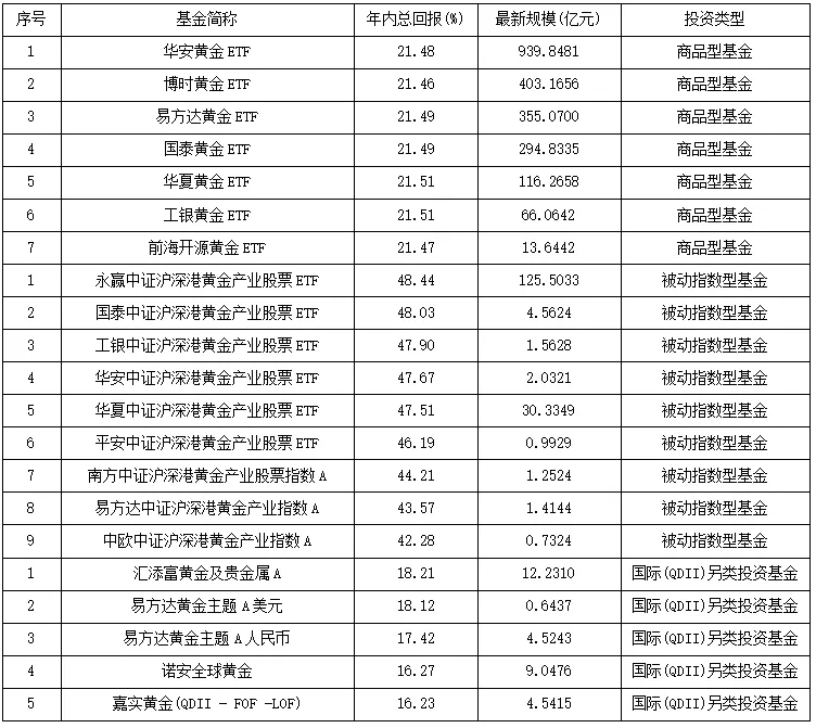表格系黄金主题公募基金2026年以来产品收益及规模