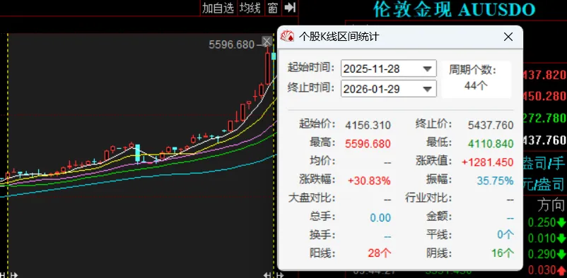 2025年12月31日,伦敦现货黄金收盘价为4325.12美元/盎司,截至2026年1月29日,其价格已逼近5600美元/盎司,期间涨幅达29.4%,短短一个月内上涨超1200美元/盎司,创下2008年以来的单月最大涨幅纪录。