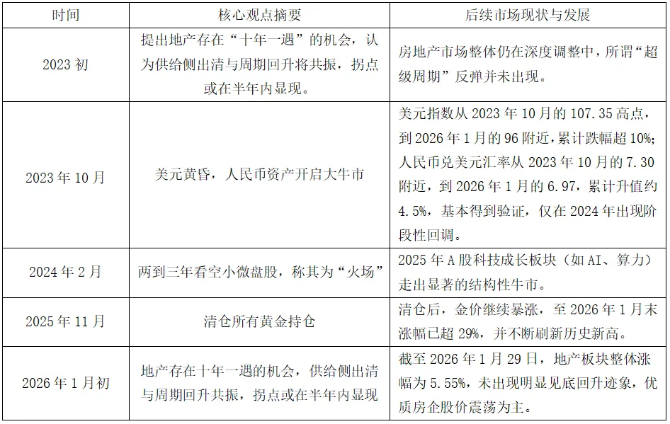 李蓓作为半夏投资的创始人,长期聚焦宏观对冲领域,其公开市场研判主要集中在地产、黄金、股市等核心资产,复盘其过往观点,从2023年初首提“十年一遇”地产行情,到2026年1月初重申相似研判,而房地产市场始终处于深度调整周期,所谓“超级周期”反弹并未出现;从2024年2月其将小微盘股比作“火场”、直言未来两到三年看空,后续2024年9月24日科技成长板块便走出结构性牛市;从2025年11月清仓所有黄金持仓,到2026年1月金价暴涨近30%、并不断刷新历史新高。关于李蓓的市场研判,市场争议似乎从未远离。