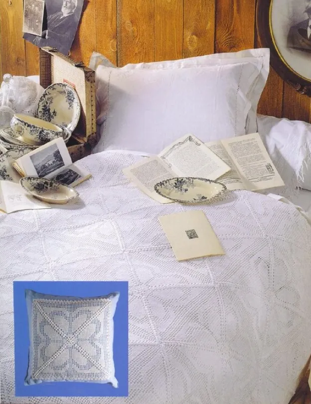 抱枕花片:用本色线,像钩织床罩那样钩织1个花片,以2圈边缘钩织结束,并用缝针缝合固定在抱枕上。