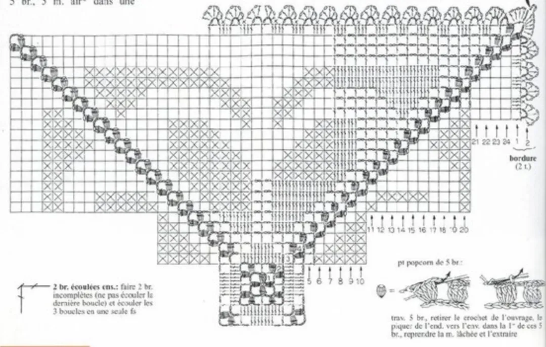 第3圈至第24圈:按照图样钩织。直到第23圈,所有圈都像第1圈那样收尾;第24圈结束时,在第1个爆米花针上钩1针引拔针,然后断线。