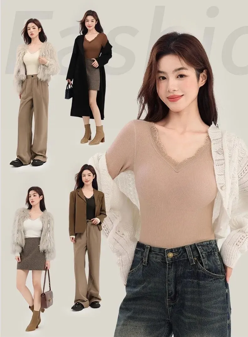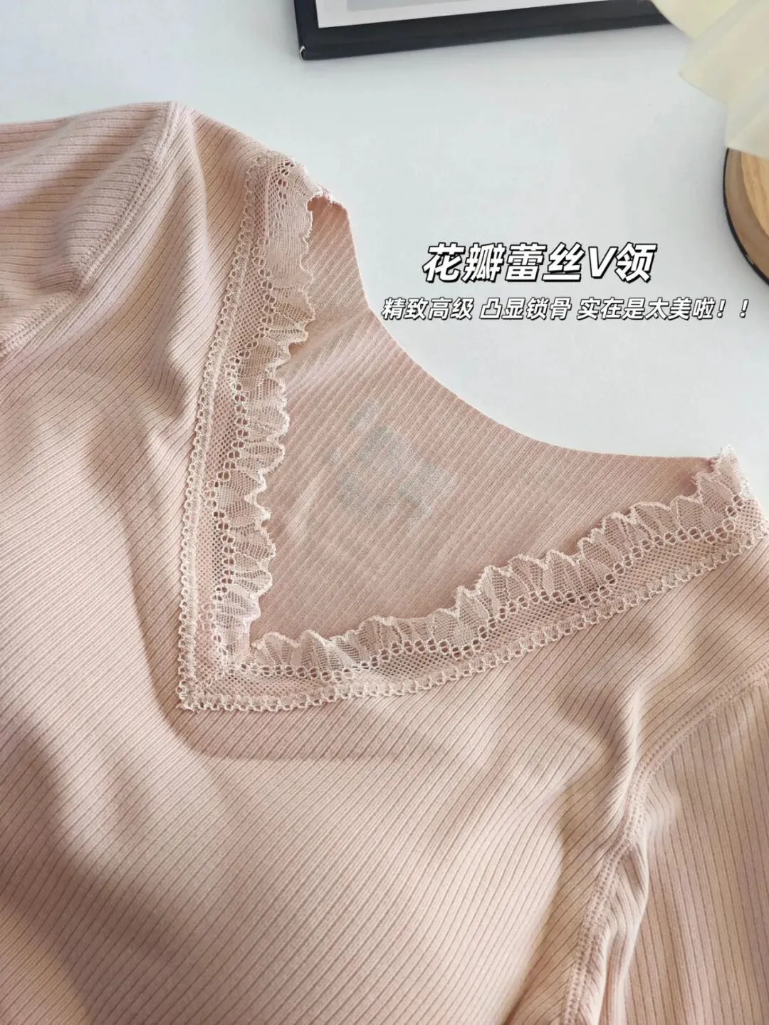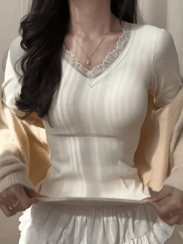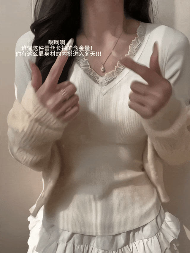 V领口+蕾丝边,不媚俗但又能给穿搭增加更多精致感;自带bra既保暖又省去了穿内衣的痛苦~