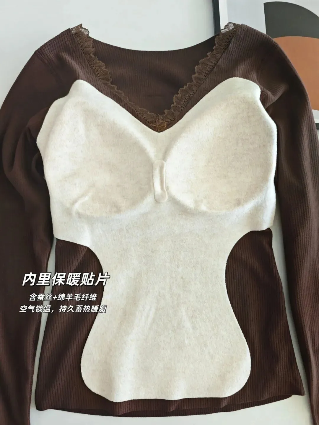 自带bra+双面暖绒+蚕丝羊毛贴片,质地细密,穿上身自带一种“环抱式”的暖意。