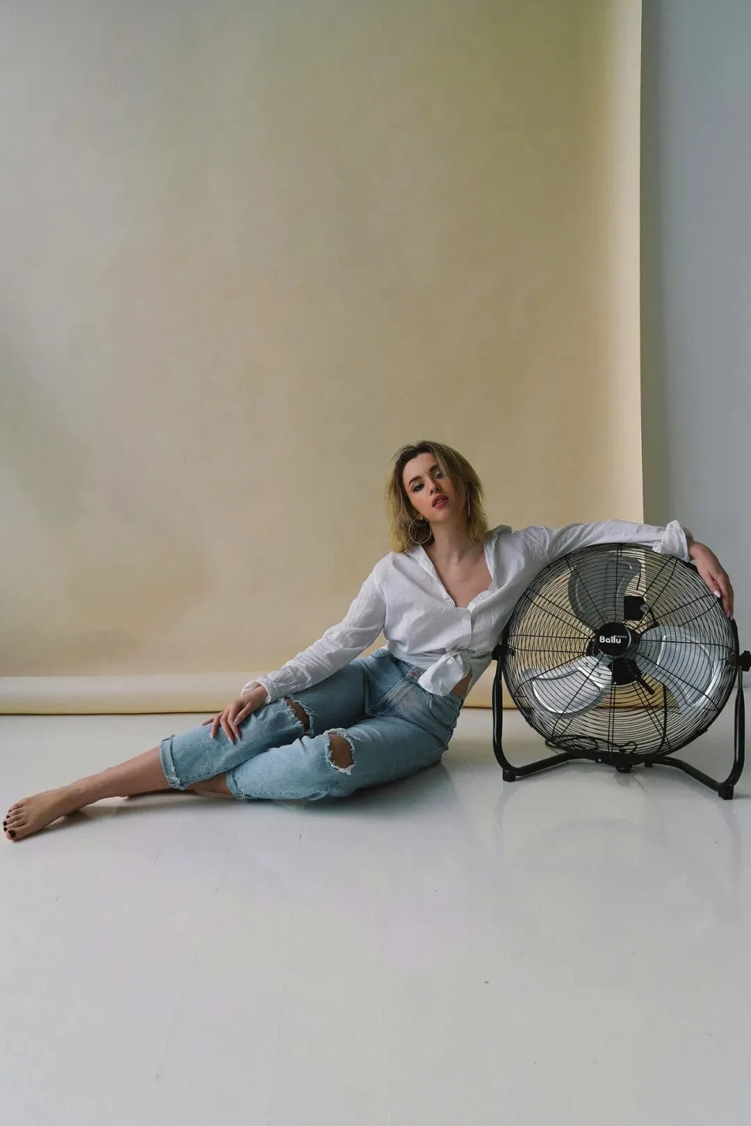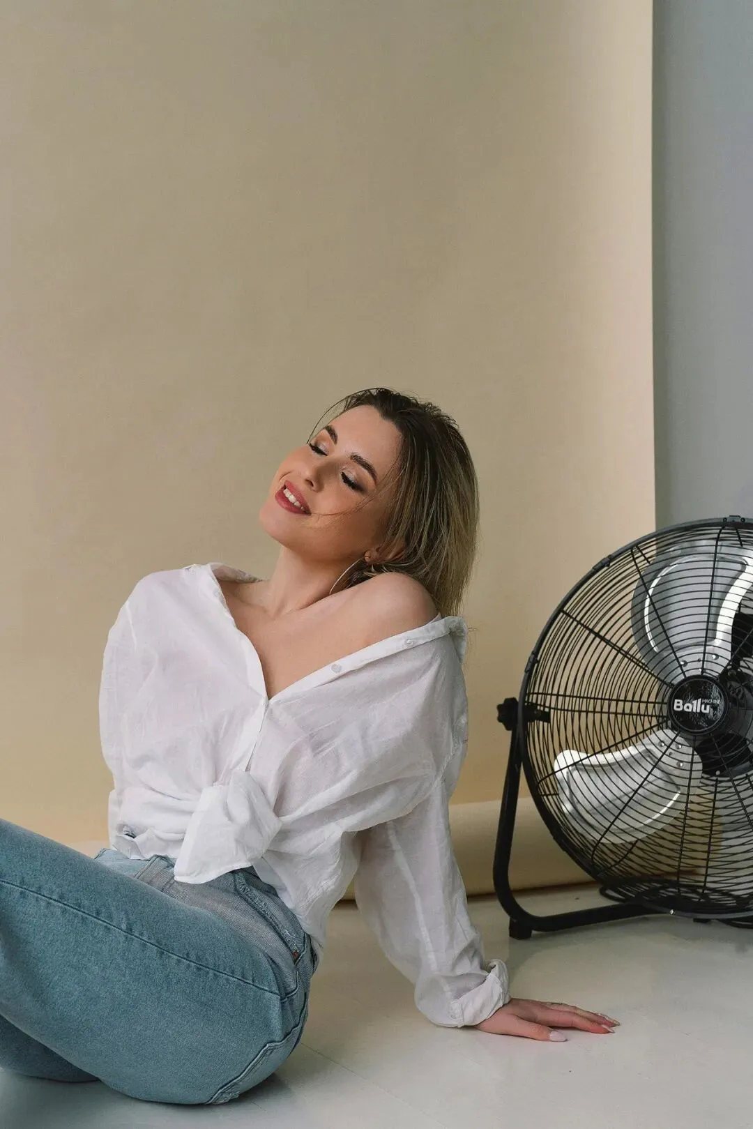 造型上,白衬衫搭配破洞牛仔裤的组合充满随性的日常感,衬衫下摆的打结设计增添了一丝慵懒的性感,与松弛的坐姿形成呼应。黑色工业风扇作为道具,冷硬的金属质感与人物的柔和气质形成视觉对比,为画面注入了复古又时髦的氛围。
