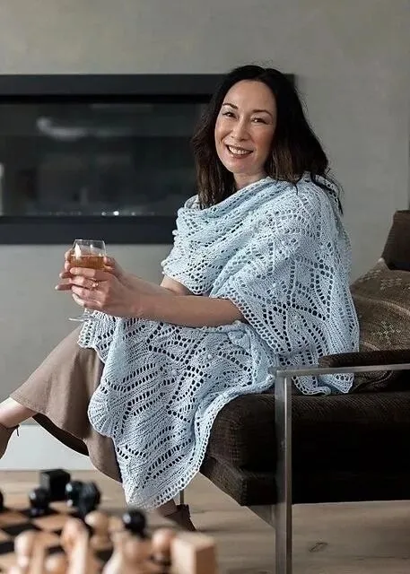 :两用设计(围巾 / 披肩)实用、三种蕾丝花样显层次、浅蓝底色清新百搭、大尺寸版型遮肉显瘦、基础棒针技法新手友好、拼接工艺清晰易操作。