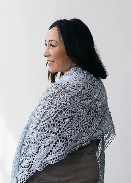 这款浅蓝棒针蕾丝披肩是一款“实用氛围感单品”:以扇形、柱形、叶片菱形三种蕾丝花样组合而成,基础棒针技法新手友好,分两片织制后拼接