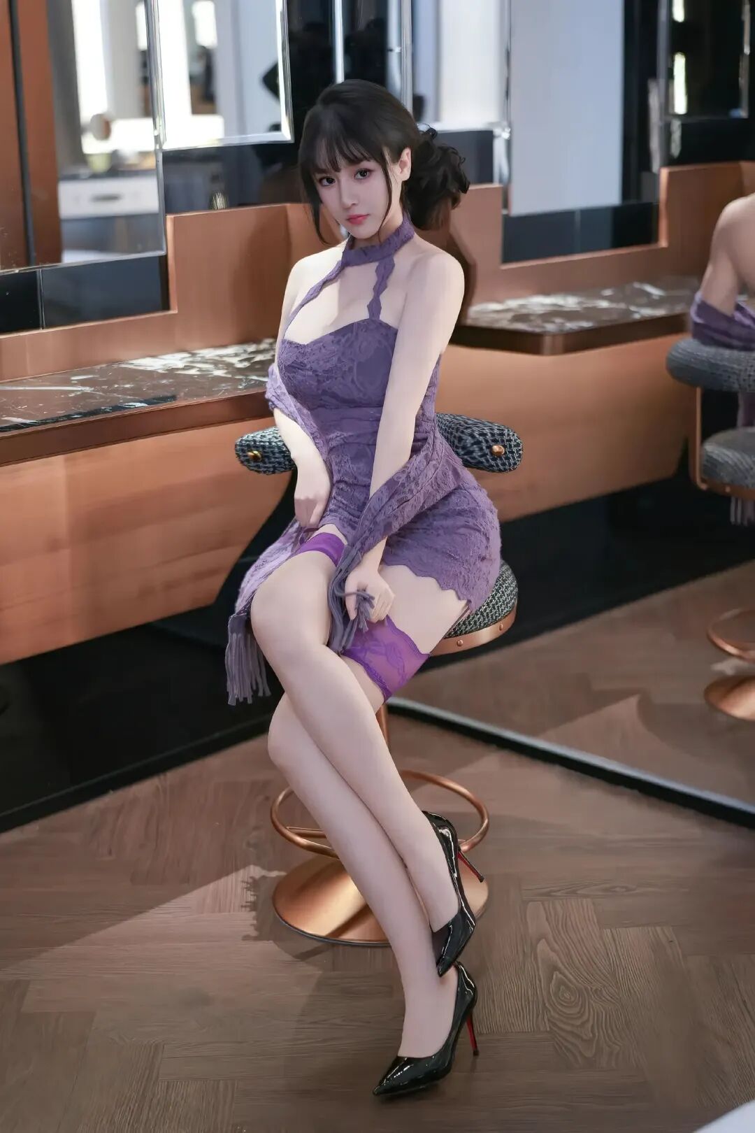 站在镜面吧台前时,她微微侧身,蕾丝的通透与吊袜带的柔媚在光影里形成奇妙对比。身后的铜色金属与镜面在背景里格外现代,她的身影在画面里既融入环境,又自带焦点,像从都市画报里走出来的魅惑女主角,带着点随性的风情。坐在吧椅上时,流苏的摆动与高跟鞋的鞋尖在动作里更显利落。她的眼神清冷却带着一丝慵懒,嘴角带着浅笑,仿佛周围的酒气与轻奢氛围,都成了她穿搭的一部分。这种 “不费力” 的好看,比刻意凹造型更有吸引力。这套穿搭的妙处,从来不是 “颜色多抢眼”,而是 “氛围够统一”。从紫调蕾丝裙到同色系吊袜带,再到简约配饰,所有元素都围绕着 “柔媚氛围感” 这个核心,材质层次的变化让整体不单调,却又没有冲突感。蕾丝的通透、流苏的灵动、皮革的硬朗,这些不同质感的碰撞,让她在这个轻奢空间里,成了自带气场的女主角。