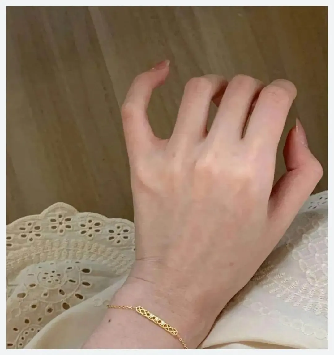 我试过几种搭配,发现它特别会“找氛围”。 有次周五穿米白法式小裙子,出门前随手扣上它,电梯灯一打,金色蕾丝刚好和裙摆的镂空边呼应——那种感觉真的像一整套设计里自带的细节。朋友见面第一句就来:“你今天好温柔,手上这个是什么?”