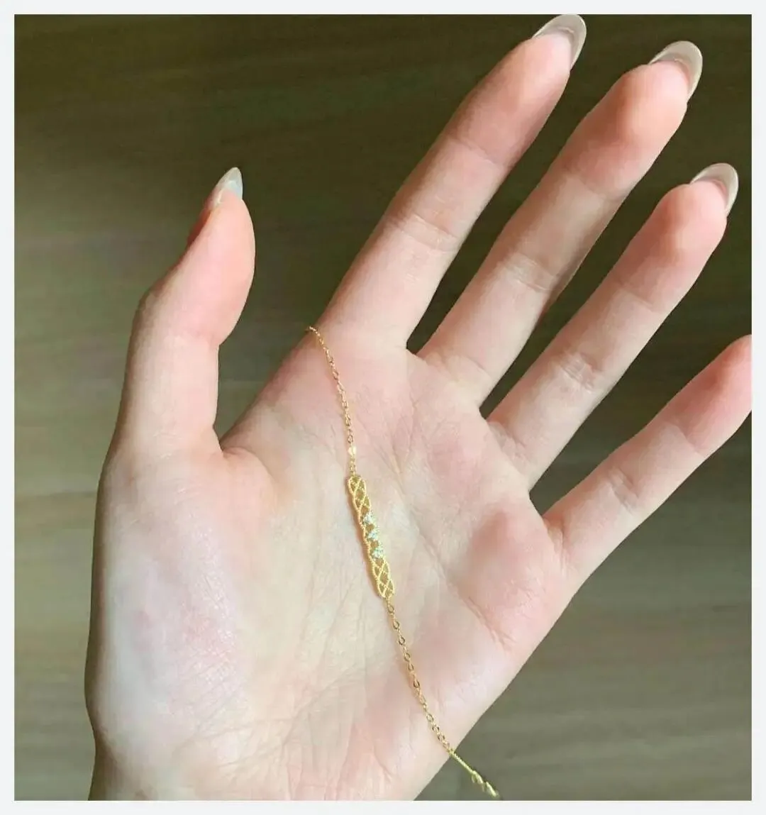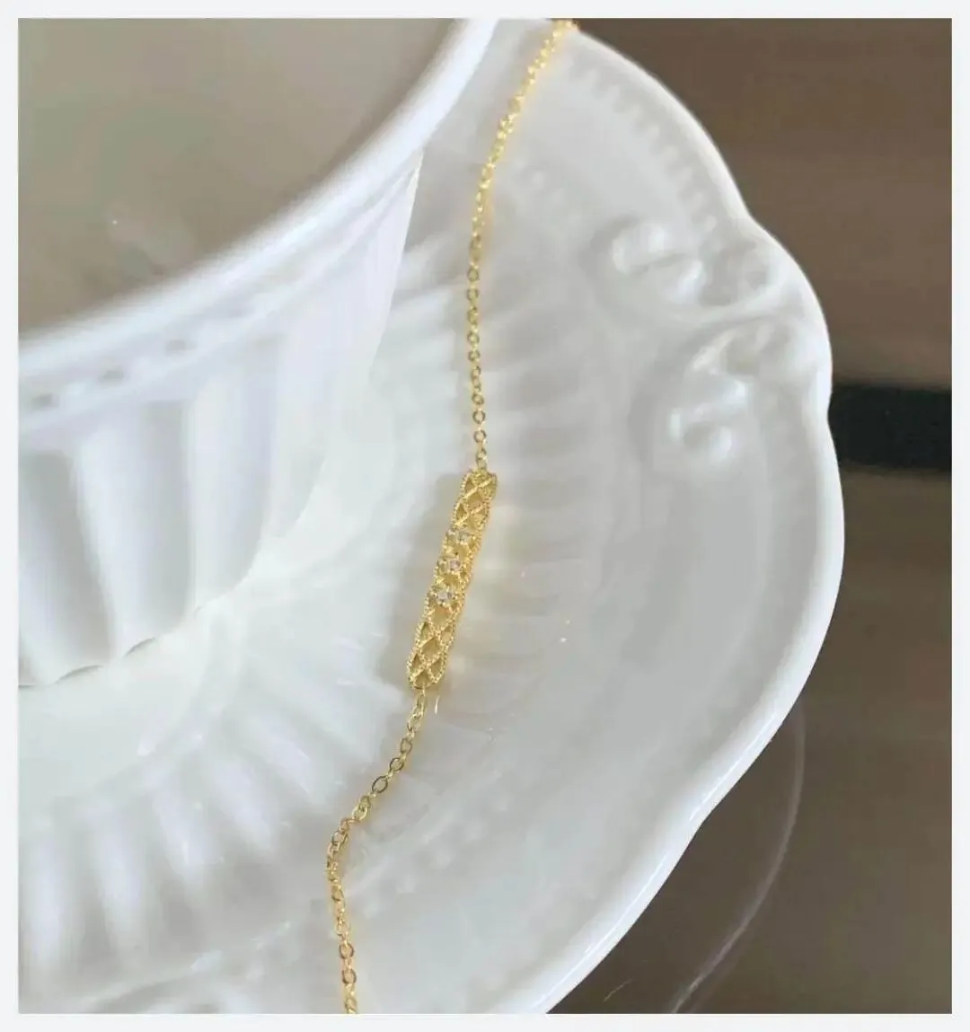 它最耐看的地方,是中间那段“蕾丝感”的网格——有点像欧式蕾丝裙边的缩小版,但不会甜到腻。中间还点了几颗小钻,你手一动,它就闪一下,真的像有几颗小星星在网格里来回走。 两边则是极细的圆链,细到你不盯着看,只会觉得那抹金色像贴着皮肤在流动。