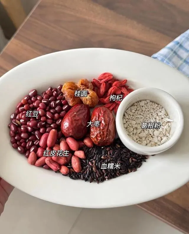 食材其实特别好记 , 五红嘛 , 红豆、红枣、红皮花生、枸杞、红糖 , 再加一个葛根粉。