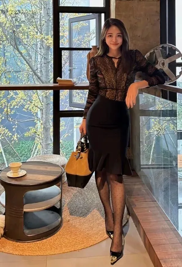 .面那身搭配.更有看.头。.黑色蕾.丝上衣.若隐.若现的.,领.口的花边.设计.有点小.女人味。.不会.太暴.露,就是那.种含.蓄的.性感。料.子薄薄的,.夏天穿.应该.不闷热.。衣摆.塞进裙.子里,腰.线立.马显出.来。.比例调整.得好.,人都挺.拔几分.
