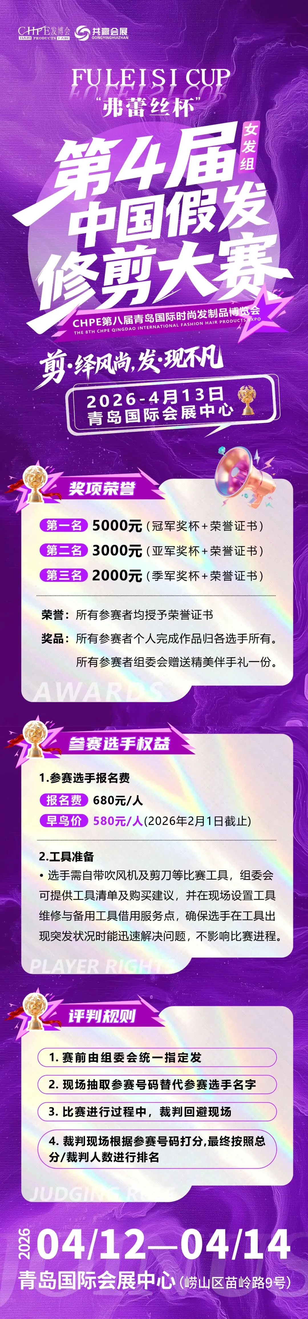 本届大赛将于2026年4月12日至14日在青岛国际会展中心,与第八届青岛国际时尚发制品博览会同期举行。这不仅是一场技艺的角逐,更是一个集竞技、展览、趋势洞察于一体的行业盛事。参赛者将在汇聚全产业链资源的平台上,直面最新潮流与技术。