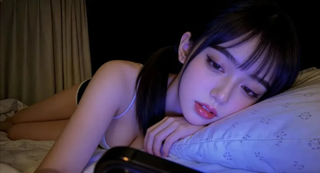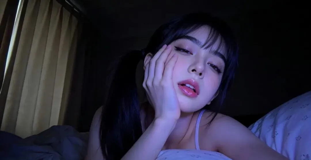 这张照片的氛围营造非常成功,整体呈现出慵懒又带着朦胧柔美的深夜氛围感。模特的双马尾造型自带少女感,与松弛的卧姿形成了巧妙的反差,既保留了青涩感,又通过微张的红唇、半垂的眼波传递出淡淡的妩媚。