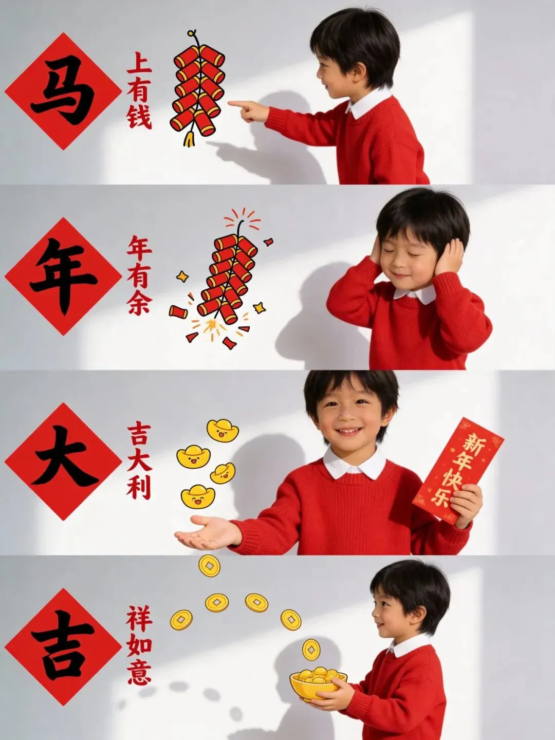 4. 人物设定:主角为参考图人物,肤色白皙,身着正红色圆领针织毛衣,内搭白色衣领,人物神态生动活泼,整体契合中国农历新年喜庆氛围