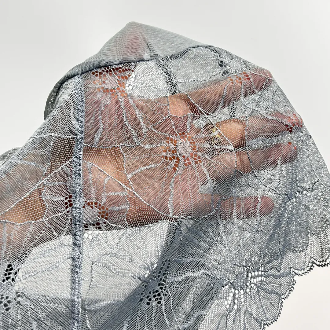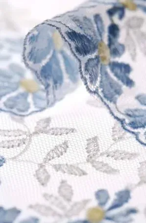 它隐而不透,图案华丽多变,因手感细腻,花纹多样从而受到皇室及明星的青睐,因精细纱蕾丝价格不斐往往只用于成衣点缀,比如婚纱、帽纱、头饰等。