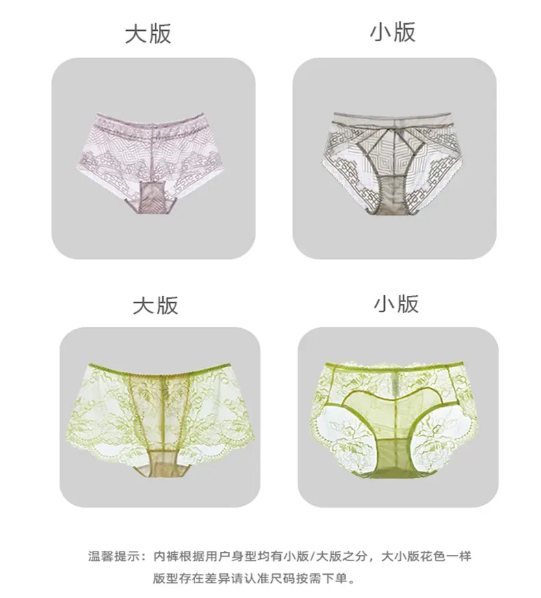 设计根据蕾丝花纹及用户身型均有小版/大版之分,花色一样,版型微有不同,请对号选择适合自己的尺码。