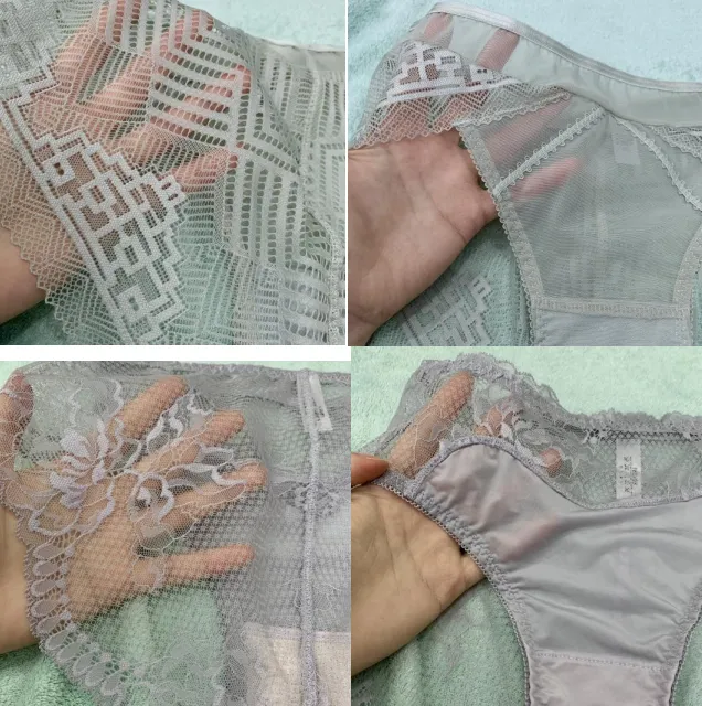我拿到手是两个花样款式,翡翠绿回形纹蕾丝内裤和烟熏紫卷草纹蕾丝内裤。
