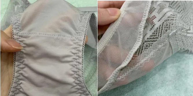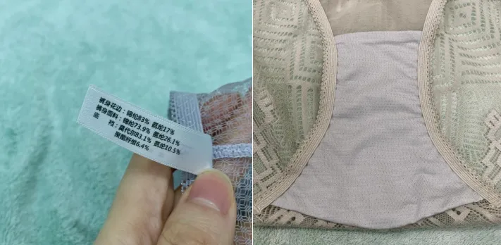 劣质的蕾丝内裤,一整条差不多用1000根粗织纱制成,弹力较差,穿在身上没型,水洗几次就变型。