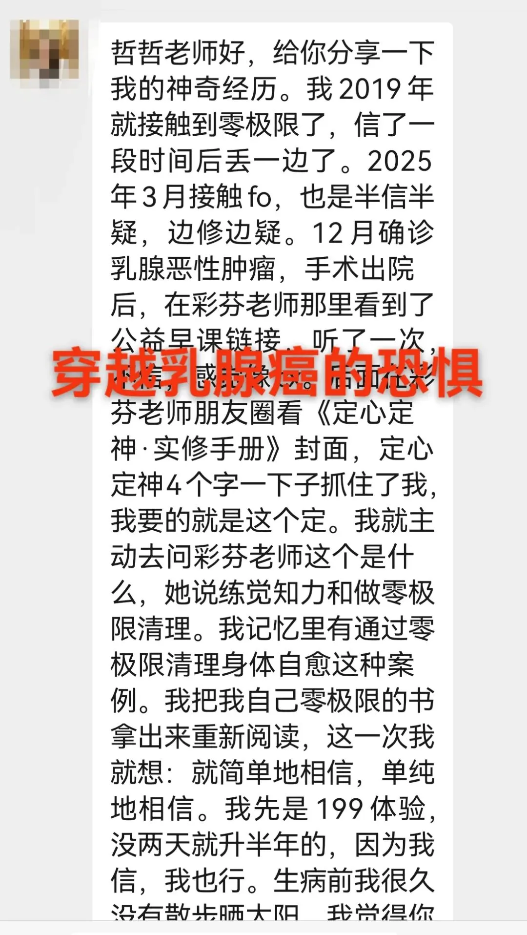 1月16日她经彩芬老师推荐果断加入我们定心定神实战群,在她日复一日的定心定神清理下,她的身体如同经历了一场暴风雨洗礼后的大地,重新迎来了光明,她告诉我们,她的身体现在健康完好,深深感恩!