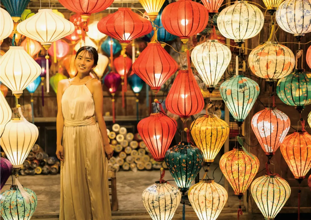 构图:满构图运用。画面被五颜六色、形状各异的灯笼充满,人物置于中心偏右,仿佛被节日的氛围包裹。这种构图极具视觉冲击力和沉浸感。