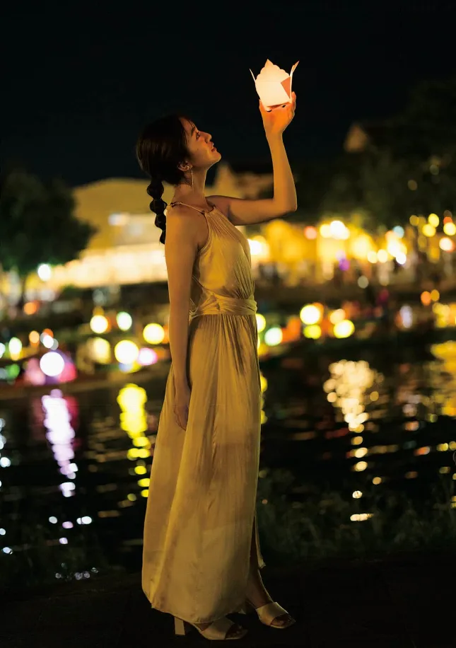 光线:低光环境下的多点光源。主光源是人物手中的灯笼,作为面光补亮面部;环境光是水面的灯光倒映和远处建筑物的装饰光。