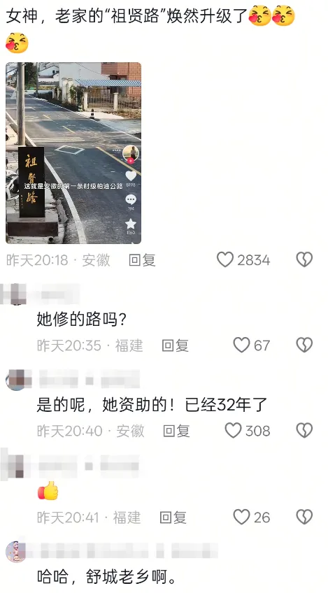 此前,还有安徽网友在评论区晒出“祖贤路”照片,向她致谢。