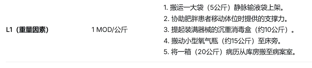 ·L1(重量因素)搬运重物(如大包装输液袋)时,每增加1公斤,增加1 MOD。提醒我们关注重物搬运的机械辅助或流程重组。
