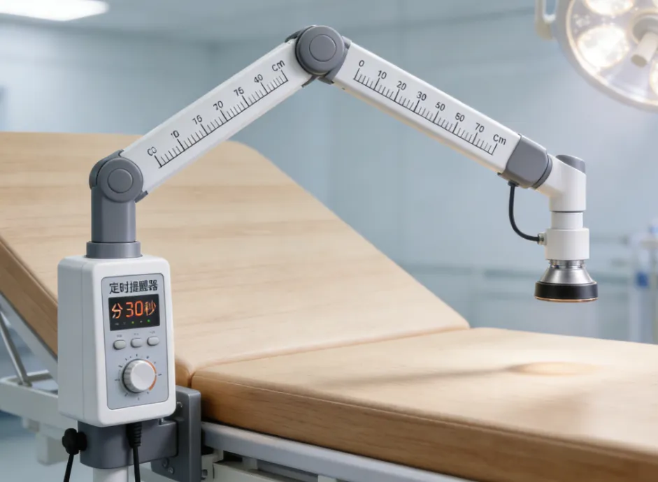 -艾灸支架:支架底座固定于治疗床旁,支撑臂可灵活调节高度与角度,并带有以厘米为单位的清晰刻度尺。