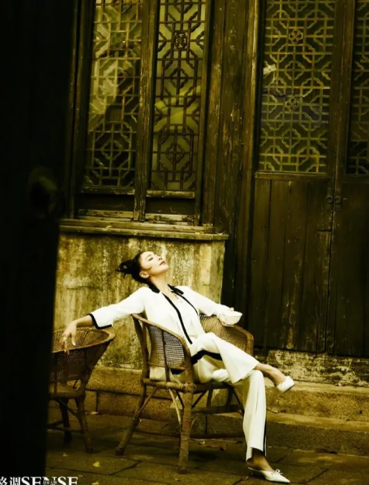 其实除了旗袍造型,刘嘉玲也穿了现代装束拍大片。比如一套纯白套装,搭配尖头猫跟鞋,整体造型精致又利落。虽说她近几年没什么新作品面世,但这种镜头表现力,和以前比一点没差。