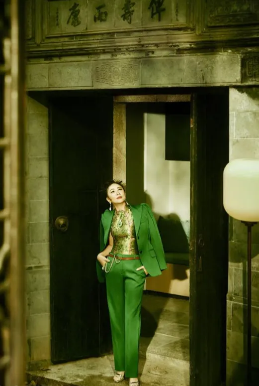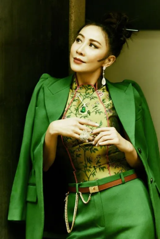 绿色本就是种高雅的颜色,不管是孔雀绿还是翠绿,都和刘嘉玲的气质格外契合。她穿的这套绿色西装,搭配翡翠首饰和改良旗袍上衣,让气质在复古和现代时髦之间自由切换,碰撞出既灿烂又明艳的独特质感