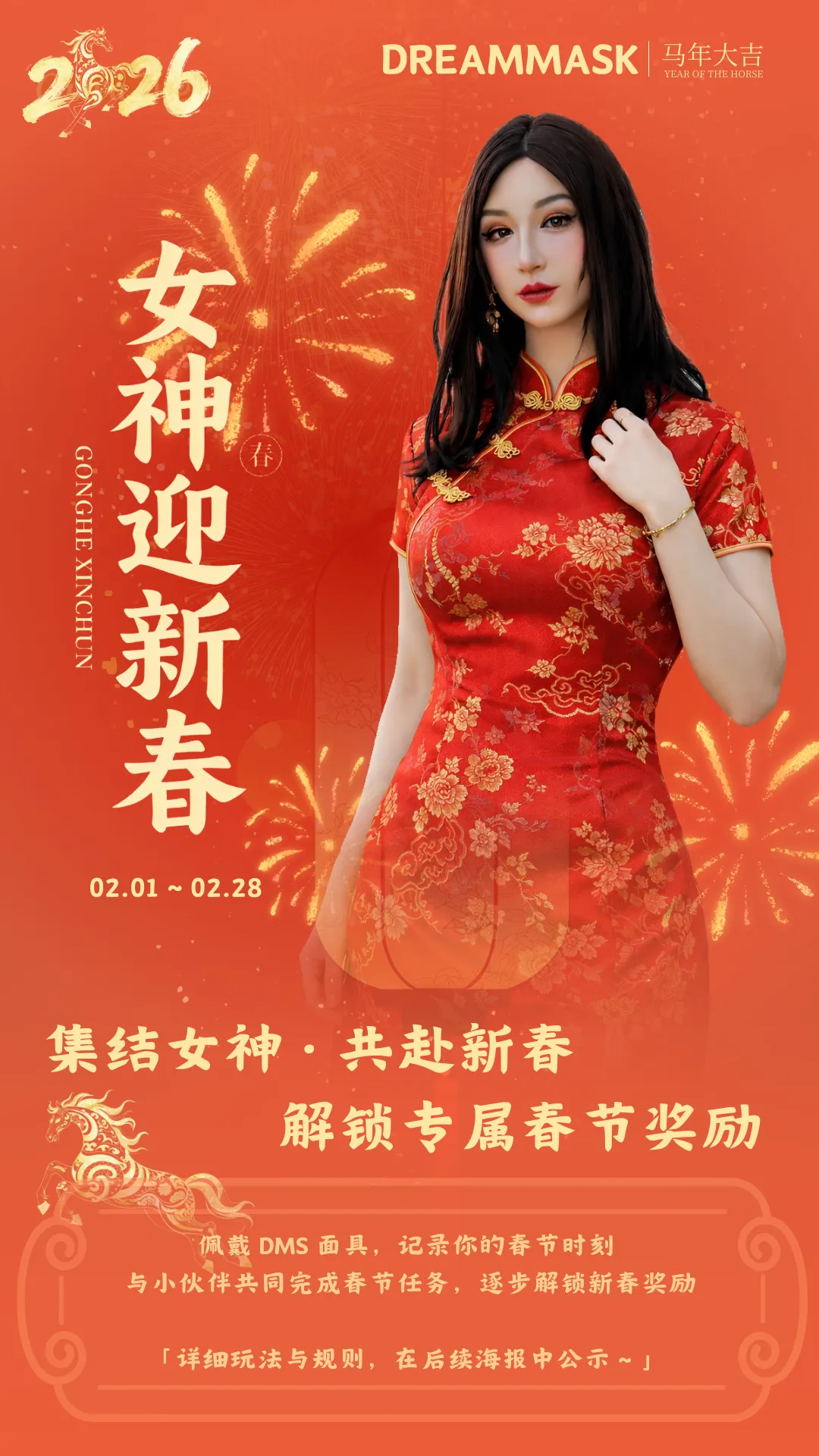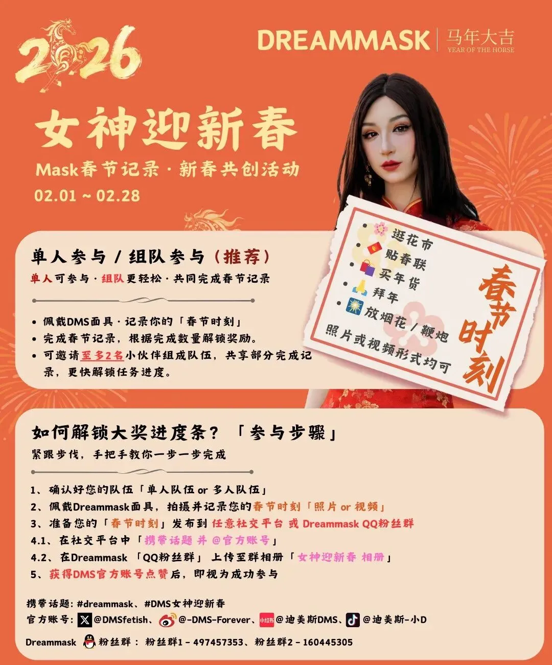 发布参与:将作品发布至任意社交平台【微博、推特(X)、抖音、小红书和B站等】,带上话题#dreammask #DMS女神迎新春 并@官方账号,或上传至Dreammask粉丝群「女神迎新春 相册」