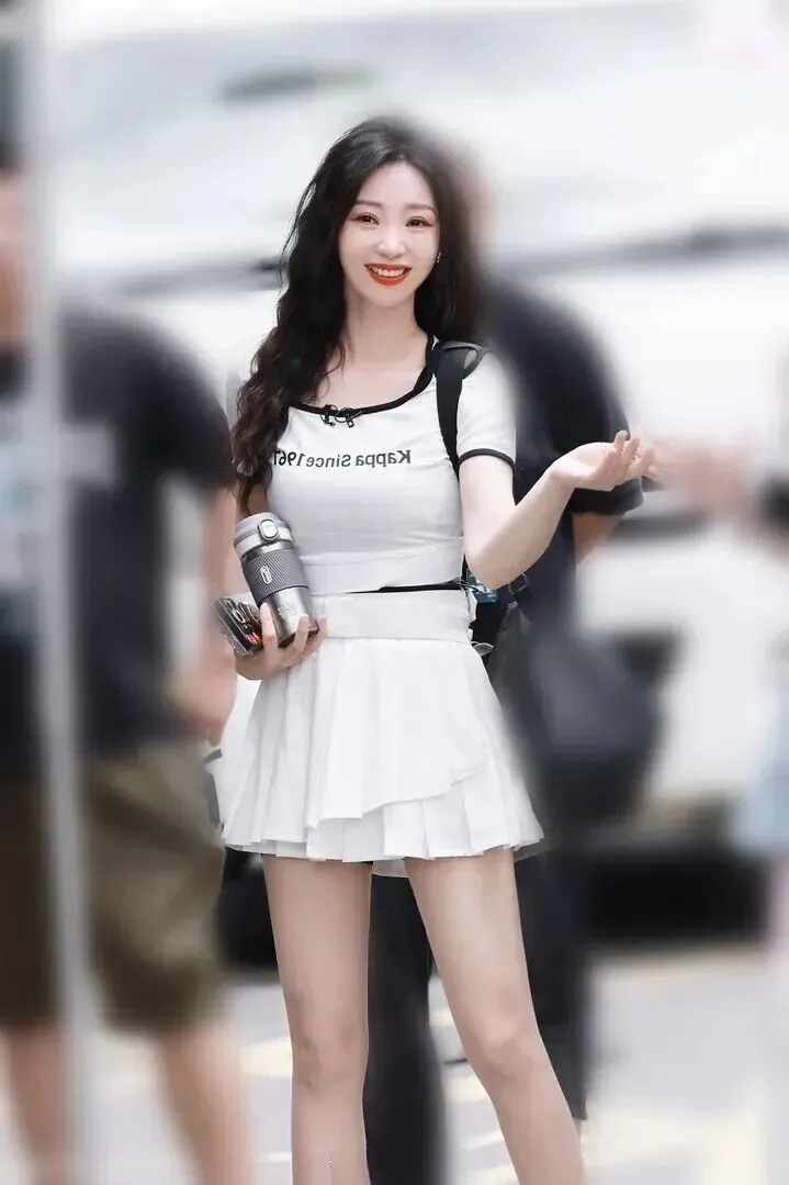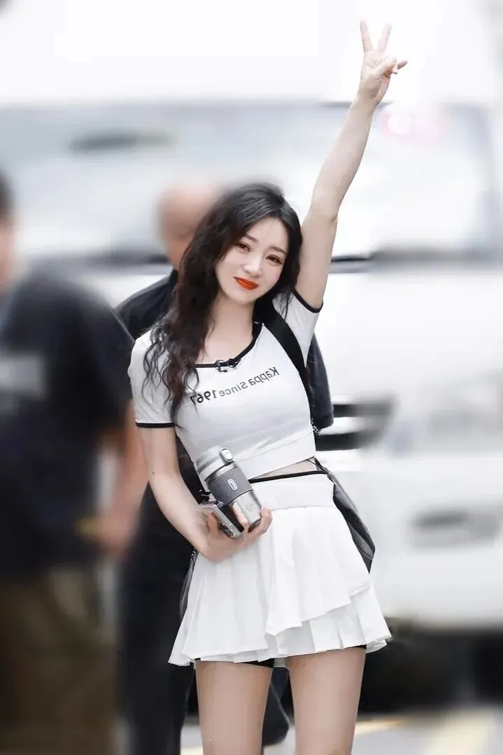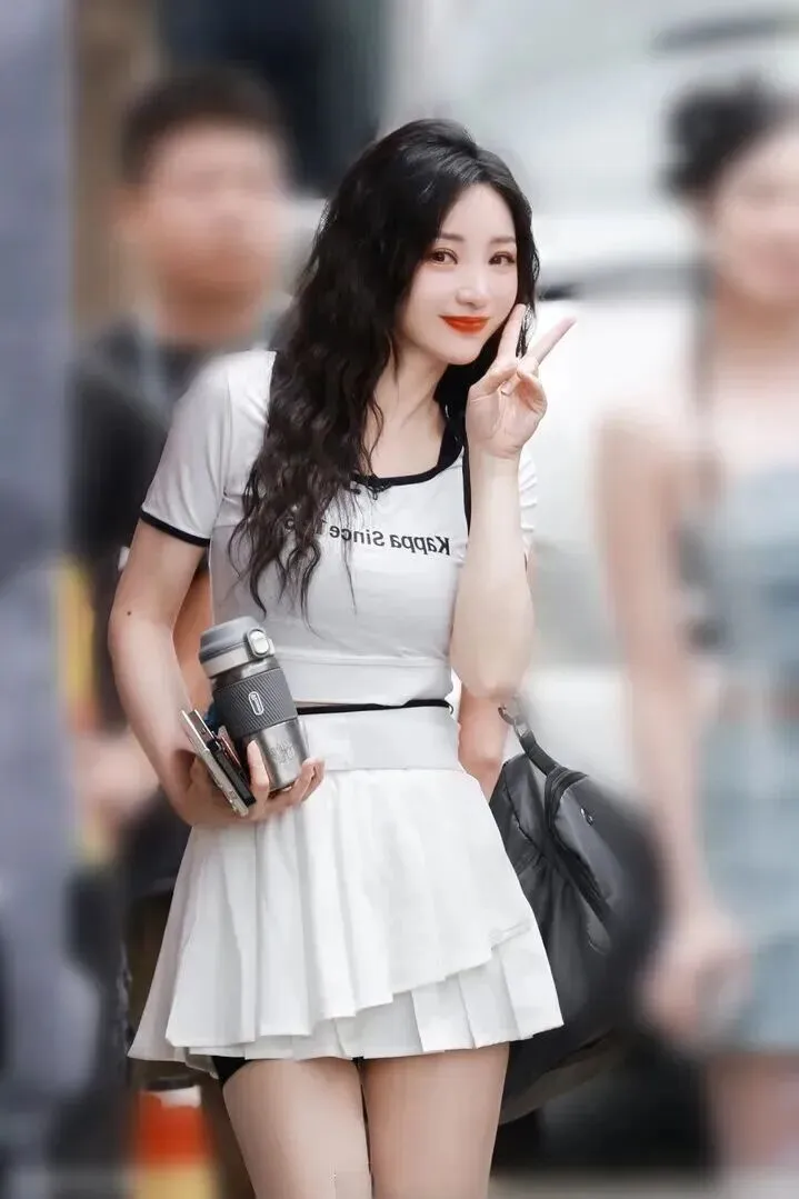 发型.和妆.容也.很加分。.一头黑色大.波浪随.意披散着.,发.质看起来好.好,柔顺有.光泽。.妆容方.面,.眼妆画得.特别细.致,眼.线勾勒得恰.到好处。.最吸睛的是.那个大红.唇,衬.得皮肤白白.的,少女感.十足。其实.淡妆也能配.这身,.但红唇.确实让.整体造型更.出彩。