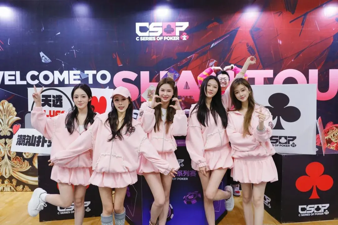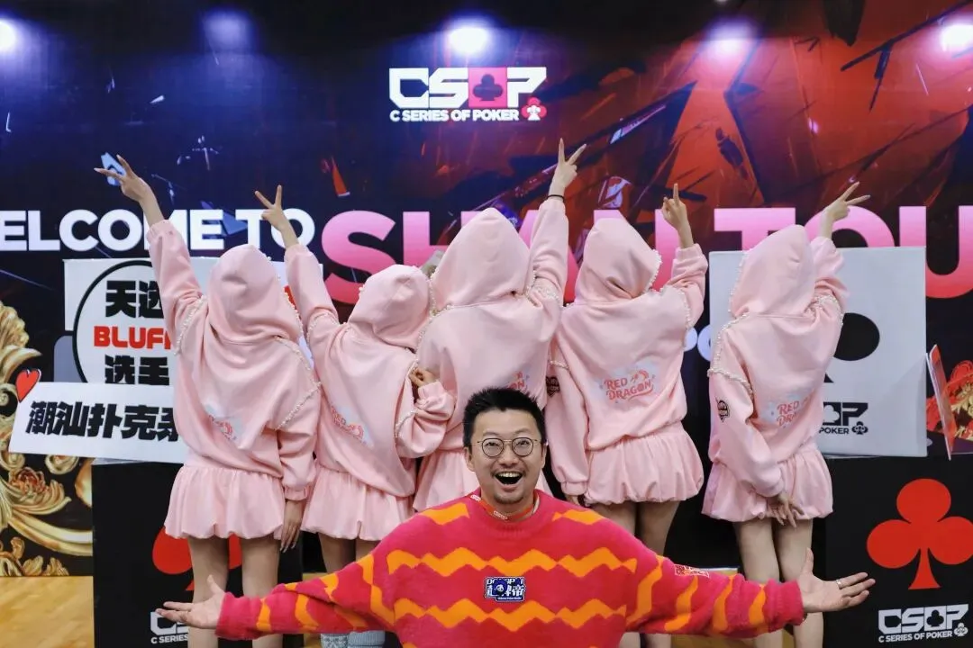 鼎哥站在CSOP-1潮汕扑克赛的舞台中央,被粉色元气的少女们簇拥,张开双臂的瞬间,幸福在此刻具象化。
