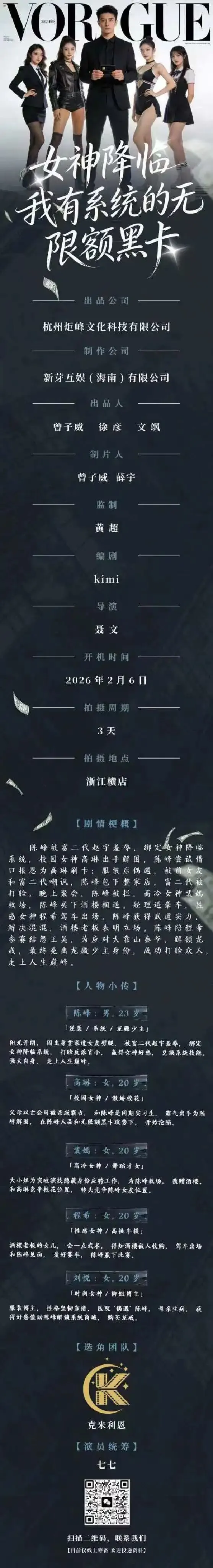 当前位置:首页>美女资讯>今日短剧组讯《女神降临,我有系统的无限黑卡》《暗夜猎手》筹备