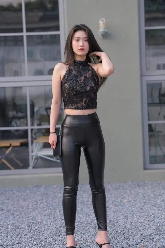 很多 20 + 的丰腴姐妹总觉得皮裤显壮、蕾丝显俗,但选对版型就完全是另一种感觉。黑色自带收缩效果,视觉上显瘦又显酷;蕾丝的镂空感能把肉 “收” 在该在的地方,高腰皮裤的纵向线条拉长了腿部比例,让整体线条更显修长。挂脖设计转移了对腰腹的注意力,细带高跟的灵动中和了皮裤的硬朗,让整体造型既有甜妹的灵动,又有御姐的气场。