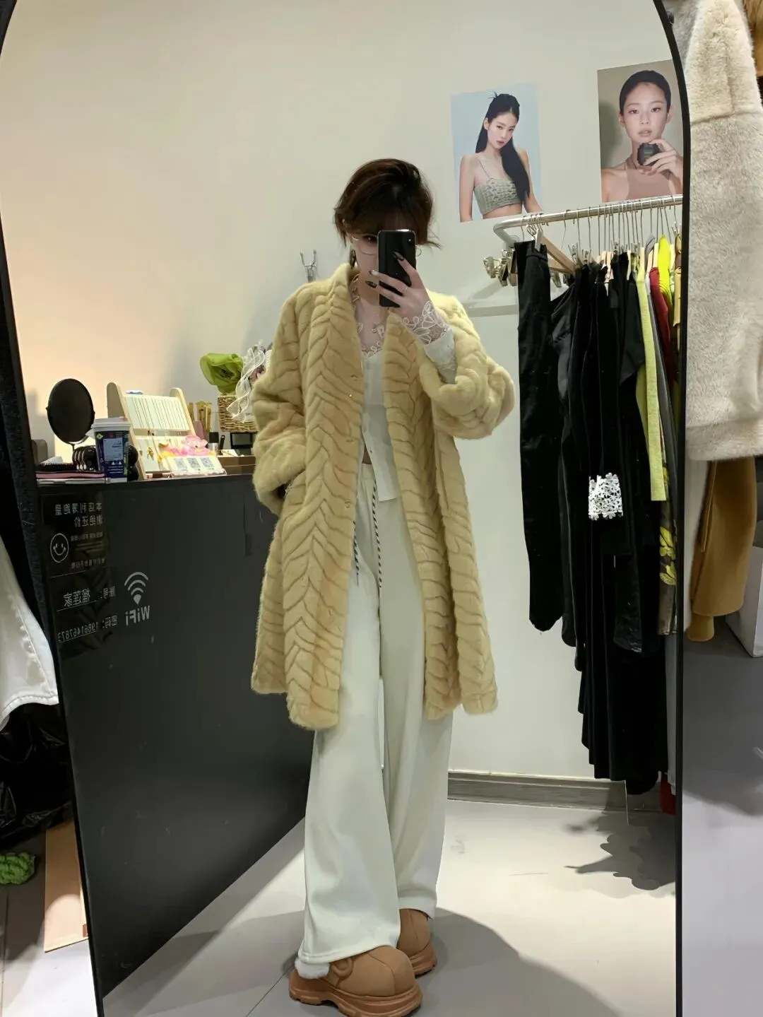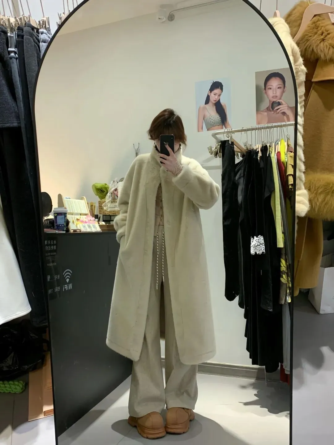 镜前正面站立,双手插进口袋,身体微微放松。米白长款皮草软糯显温柔,米色阔腿裤垂坠感拉满显腿长,厚底鞋强化松弛感。插兜姿势让手部不悬空,同色系穿搭 +镜面纵深感显高显瘦,慵懒随性的气质全程在线。
