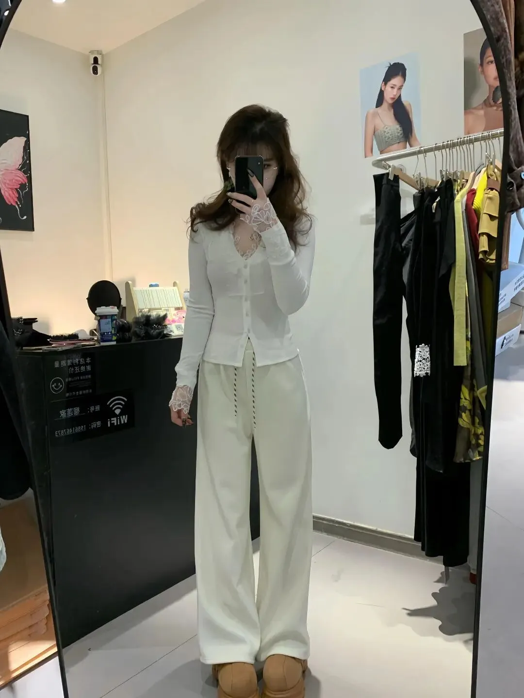 镜前正面放松站立,双手自然垂落身体两侧,身体微微放松。白色蕾丝内搭的镂空细节尽显纯欲感,白色阔腿裤宽松版型弱化腿部线条更显纤细,同色系穿搭 + 厚底鞋显高又协调。双手垂落避免手部悬空,利用镜面纵深感让身形更修长,温柔气质拉满。