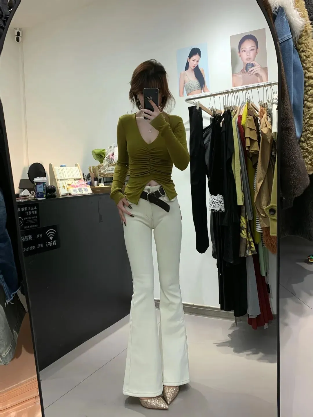 镜前侧身站立,一手叉腰一手挡脸,身体微微倾斜。橄榄绿 V 领衫修身显曲线,白色微喇裤+ 金属高跟鞋强化辣妹风格,腰带点缀提升腰线。叉腰动作凸显身形曲线,微喇裤 +镜面纵深感最大化拉长腿线,甜酷辣妹感直接拉满。