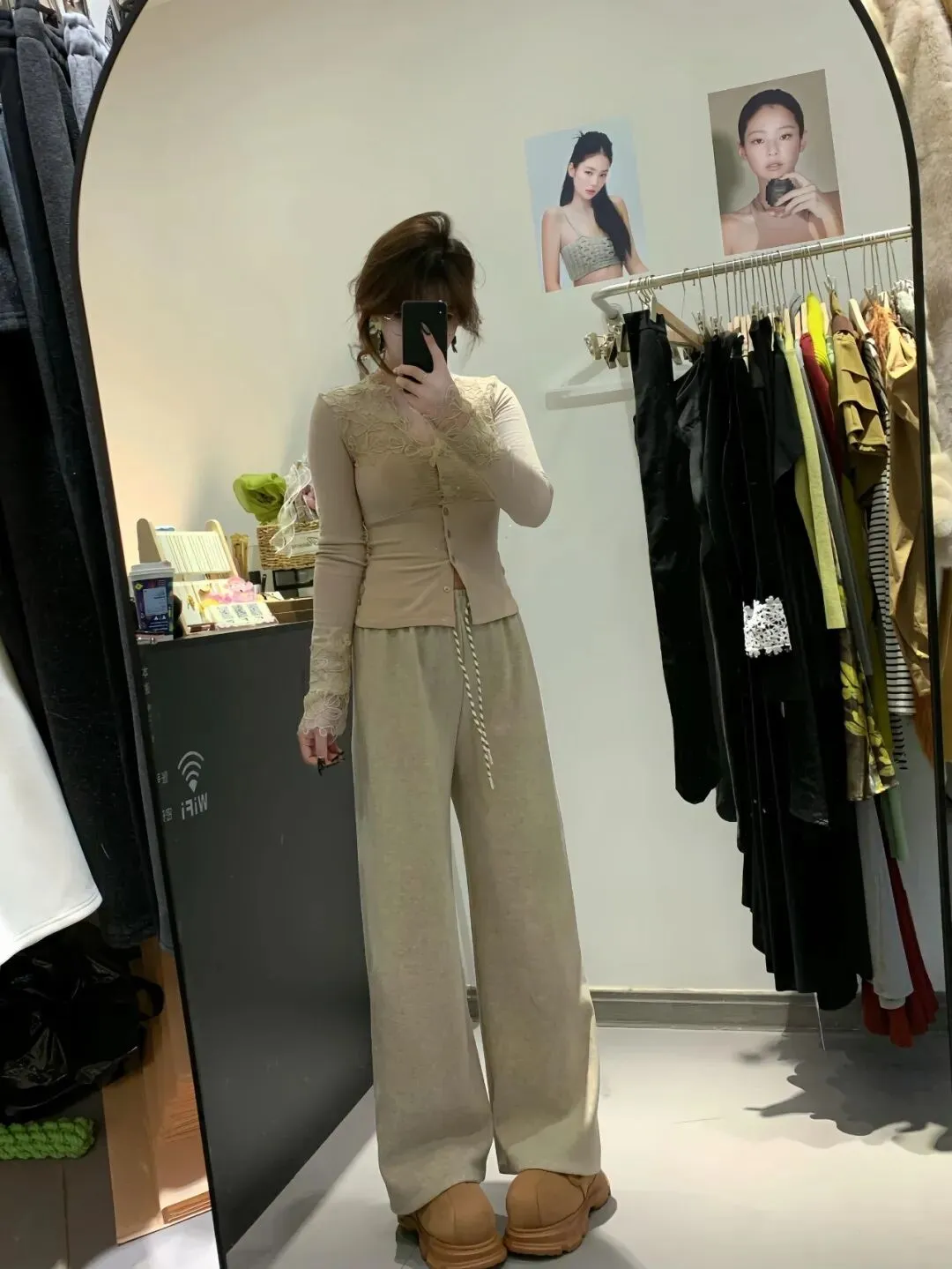 镜前正面放松站立,双手自然垂落,身体微微放松。米色蕾丝内搭的精致细节提升质感,米色阔腿裤垂坠感拉满优化比例,同色系穿搭 + 厚底鞋显高又温柔。双手垂落避免手部悬空,借助镜面纵深感让身形更显修长,松弛随性的气质在线很高级。