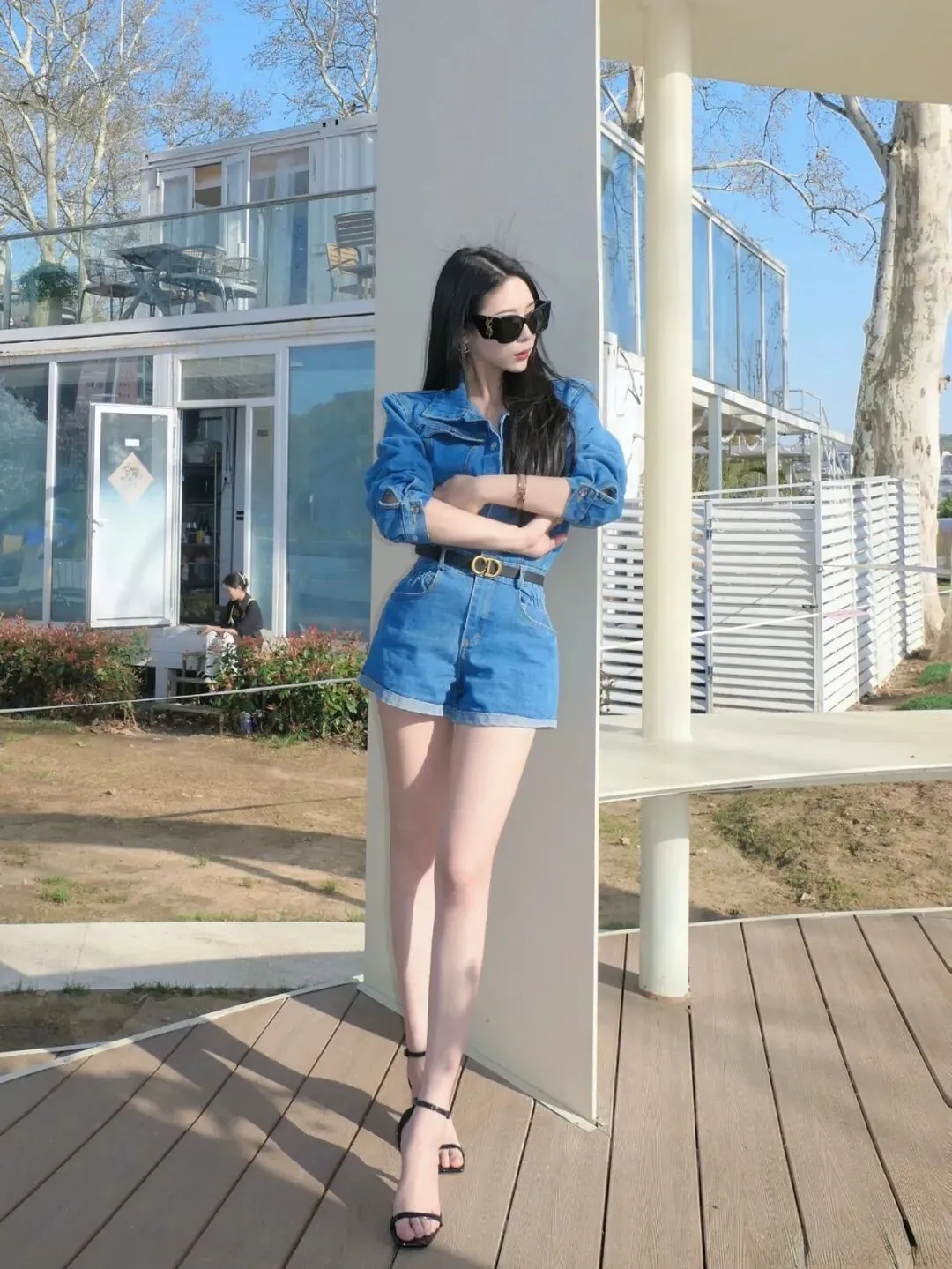 她脚上的黑色细带高跟凉鞋,无疑是造型的点睛之笔。细带的设计简约而时尚,与牛仔连体短裤的风格相得益彰,高跟则进一步拉长了腿部线条,让她的身材比例更加完美,走动间尽显优雅与自信。
