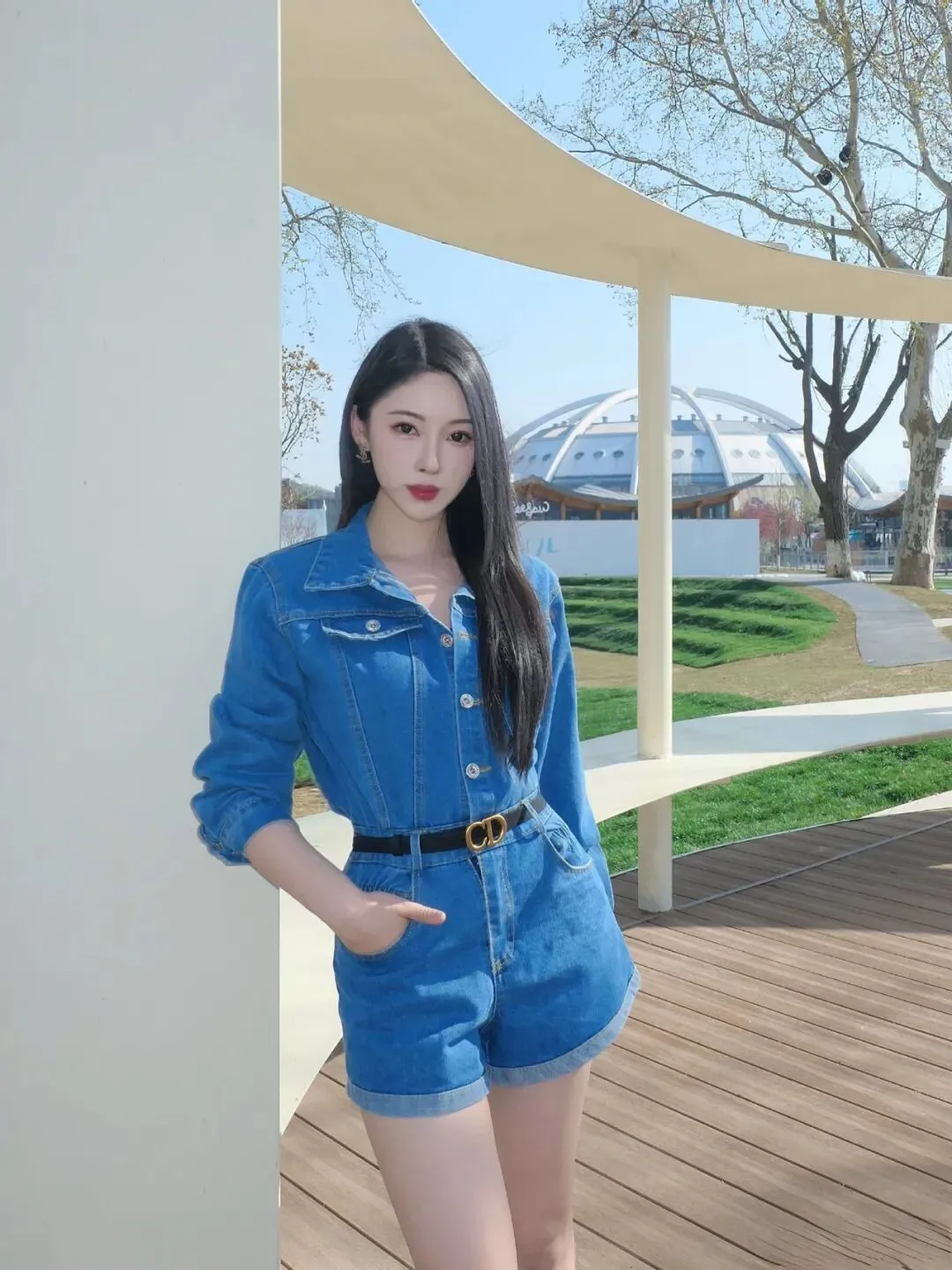 画面中,周周kiko身着一套蓝色牛仔连体短裤,仿佛将春日里的清新与活力都凝聚在了身上。蓝色的牛仔面料,带着一种复古又摩登的质感,既有着牛仔独有的硬朗与随性,又不失时尚的精致感。连体短裤的设计巧妙至极,上衣部分利落的剪裁和翻领设计,透着几分干练与洒脱。