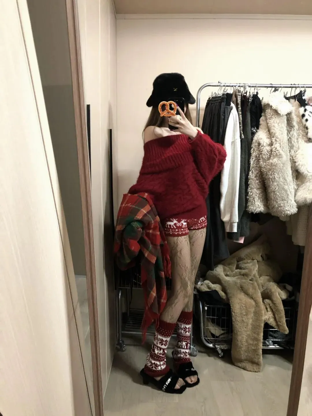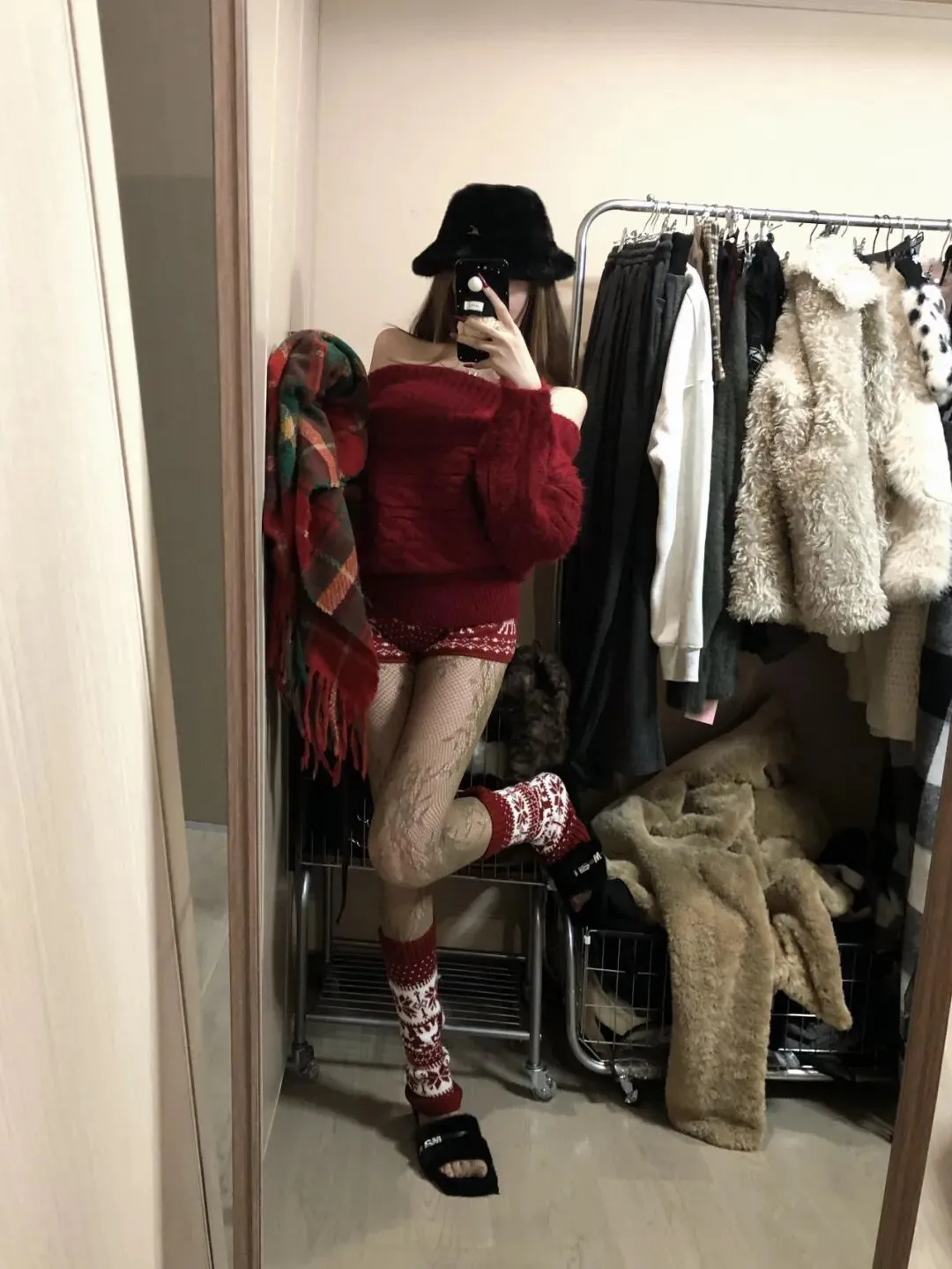走廊内侧身站立,一手持手机挡脸,身体微微放松。红色圣诞风针织衫软糯显节日氛围,圣诞花纹短裤 + 黑丝 + 红袜强化甜酷感,黑色毛绒帽与格纹围巾提升复古层次。靠墙姿势借助走廊纵深感拉长身形,节日氛围感直接拉满。