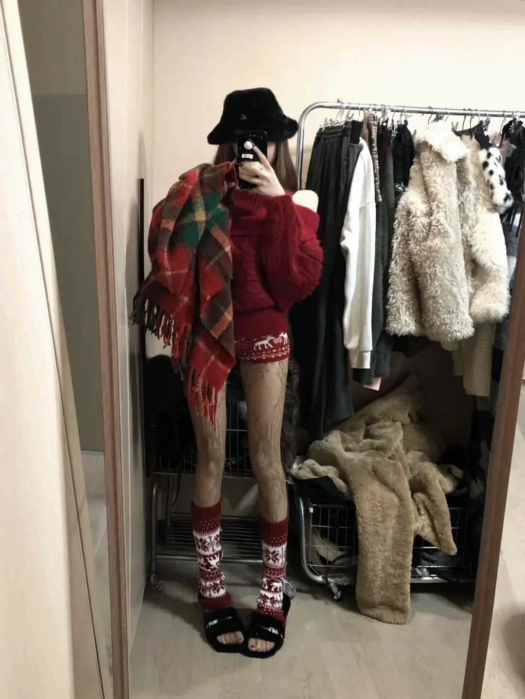 走廊内正面站立,格纹围巾披肩,持手机挡脸,身体微微放松。红色针织衫的热烈感与格纹围巾的复古感平衡,圣诞袜 + 黑丝显高又协调,黑色毛绒帽统一风格。垂臂姿势避免手部悬空,披肩动作强化慵懒随性气质,节日氛围在线很绝。