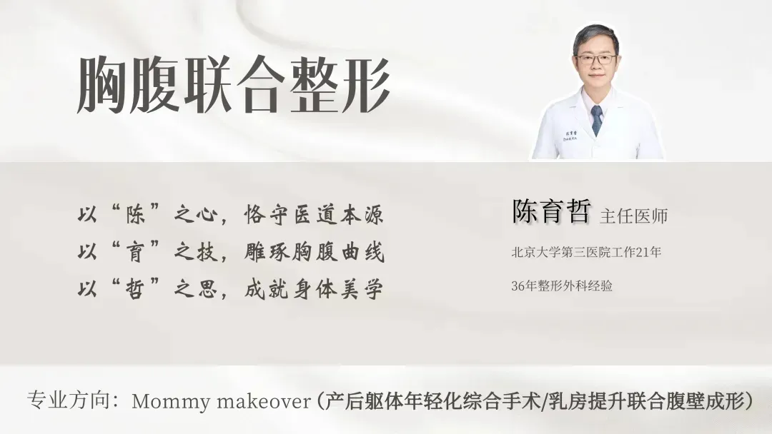 陈育哲,主任医生。毕业于北京大学医学部研究生院,师从于我国整形外科奠基人王大玫、孔繁怙、李健宁等教授,曾在北医三院成形外科工作21年,国内外学术期刊发表过30多篇学术论文。曾担任《中华医学美学美容杂志》脂肪专刊、《中国美容医学杂志》乳房专刊执行主编,主译世界整形名著"三部曲"。