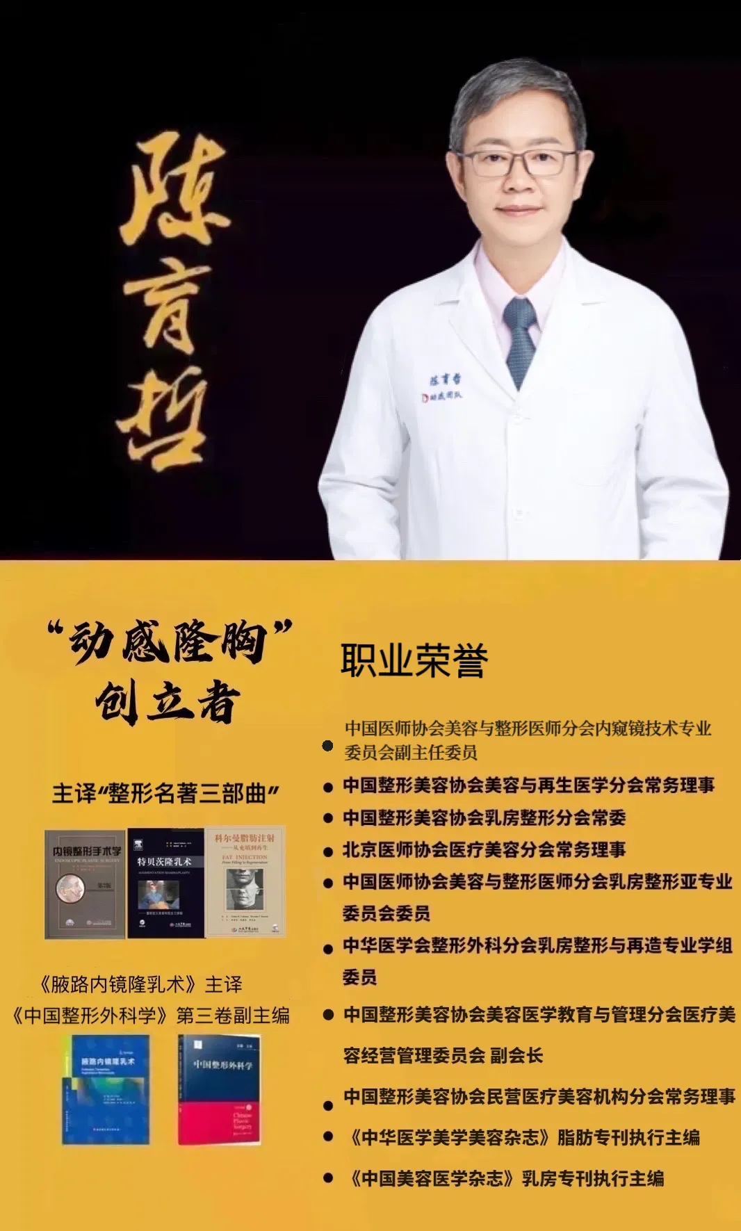 曾担任中国整形美容协会脂肪医学分会副会长,主译的国际脂肪巨著《科尔曼脂肪注射》,被称为脂肪移植的“金标准”。