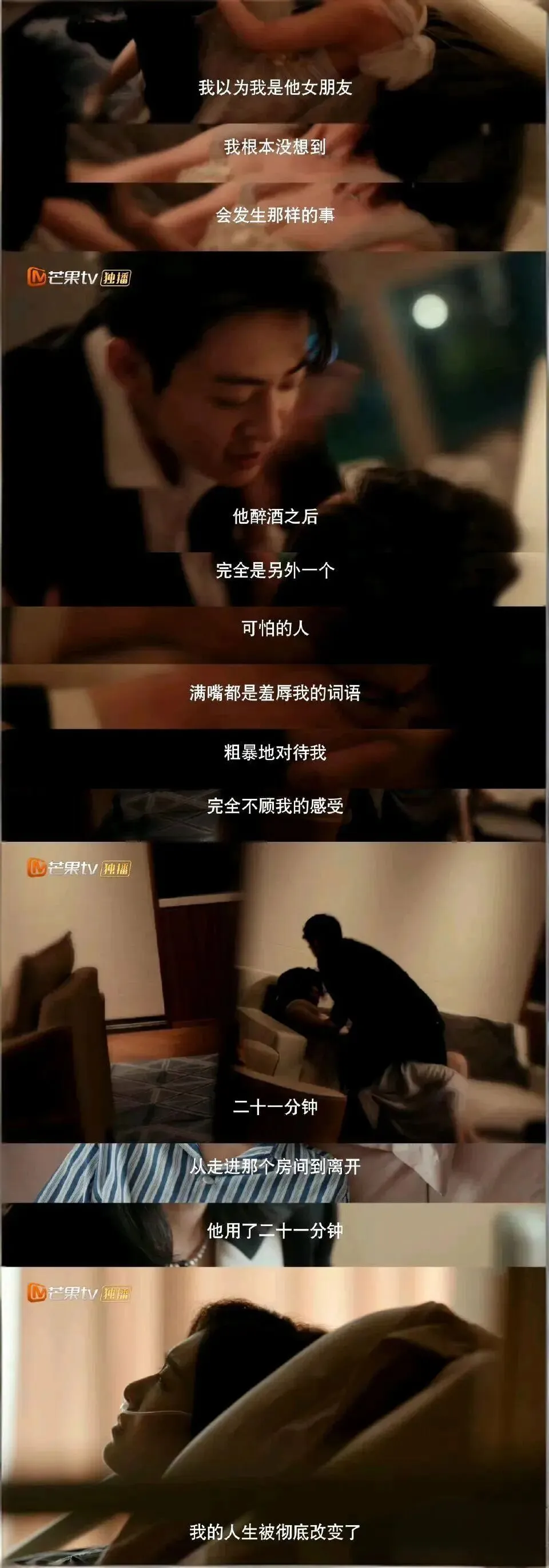 在无人注意的休息室,史力粗暴地将张怡拉坐于腿上进行肢体控制,捂住其口鼻阻止呼救,并动手撕扯对方衣裙,凭借力量优势实施猥亵。昔日绅士形象瞬间崩塌,暴露出压迫与侵犯的本质。