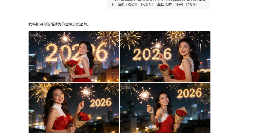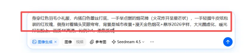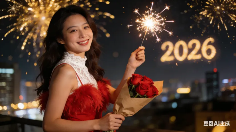 • 女生版(可复制):身穿红色羽毛小礼服,内搭白色蕾丝打底,一手举点燃的烟花棒(火花炸开呈星芒状),一手轻握牛皮纸包装的红玫瑰,侧身对着镜头笑眼弯弯,背景是城市夜景+漫天金色烟花+悬浮2026字样,大光圈虚化,暖光打在脸上,画质4K高清,比例3:4,柔焦质感